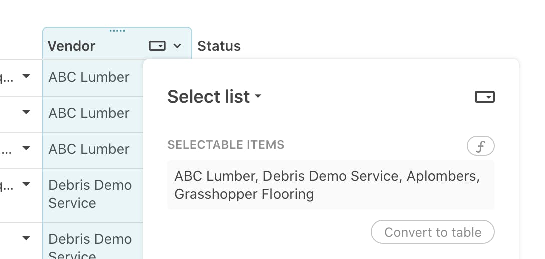 Star schema isn’t just an evolution of OBT. The lookup column type can also link two (or more) existing tables. Let’s say you want to connect the Room and Vendor tables below. Add a lookup column to the Room table, and select New Lookup > Vendor. Now you can select the vendor working in each room.