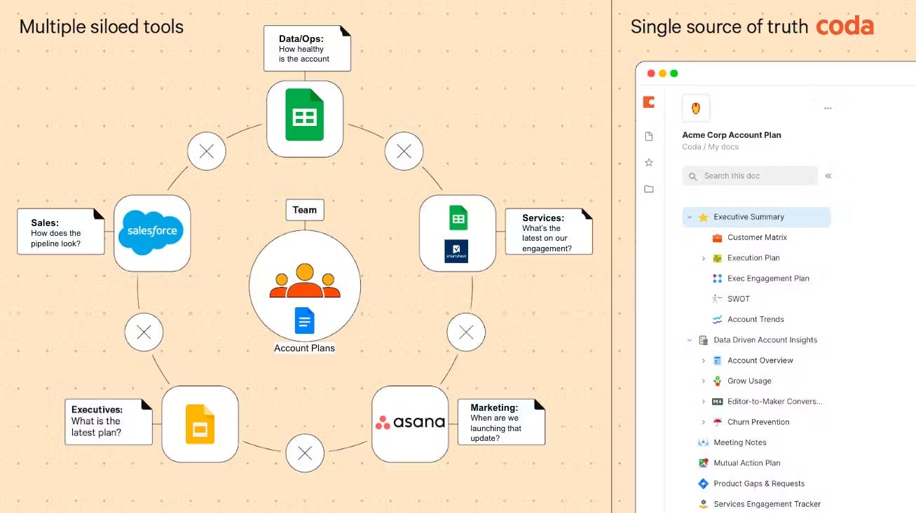Coda starts with a familiar doc surface, but with structure and smart organization specifically designed to prevent doc sprawl. That combination of low floor and high ceiling puts sales in a strong position to reimagine productivity.