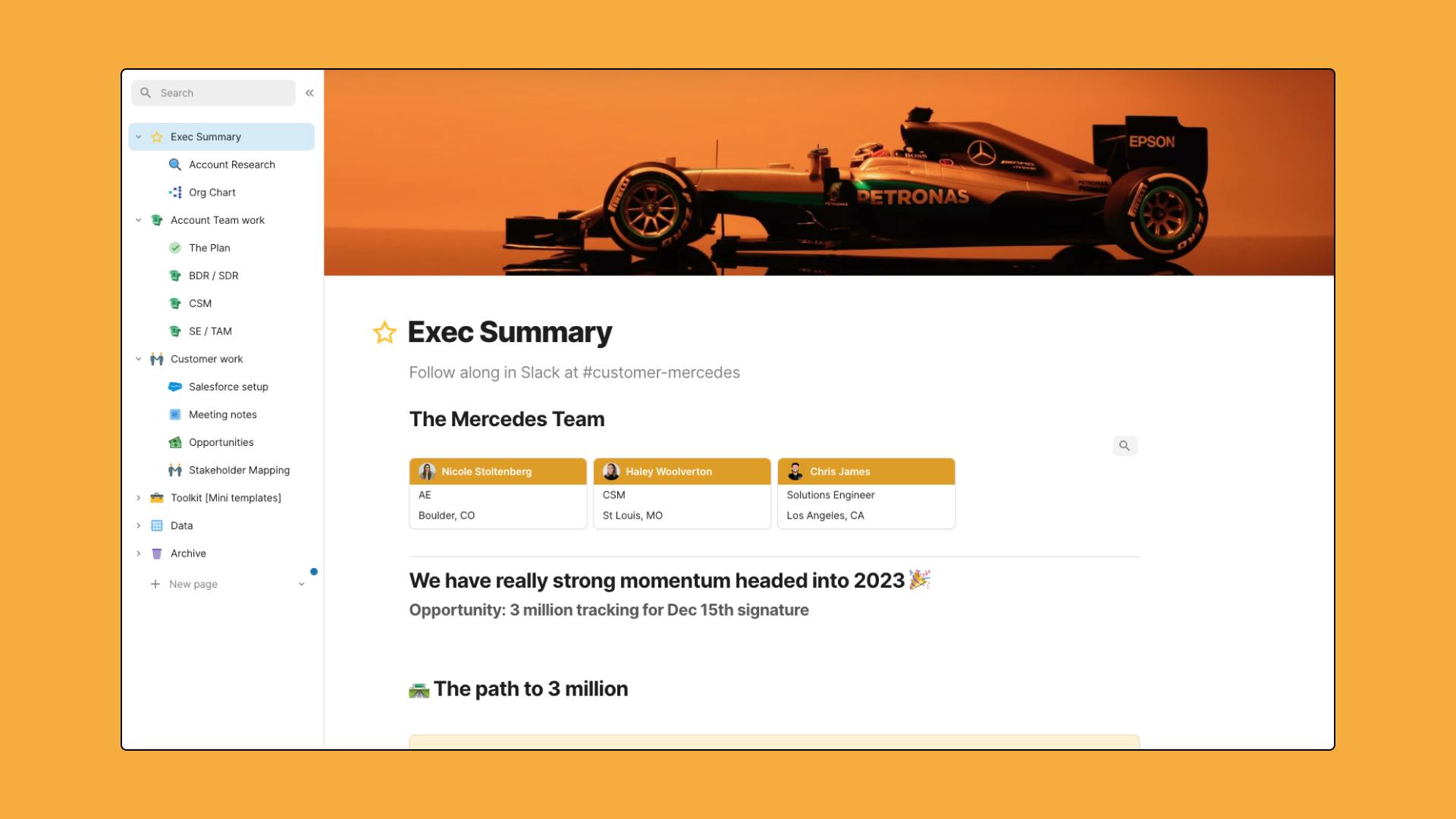 What does this look like? A Google Sheet with a list of accounts by rep and hyperlinks to a Google Doc account plan, executive summary in Google Slides, and the account record in SFDC. Oh, and then feature requests are in Jira, professional services updates are in another Google Sheet, marketing launches are in another tool ... sound familiar?