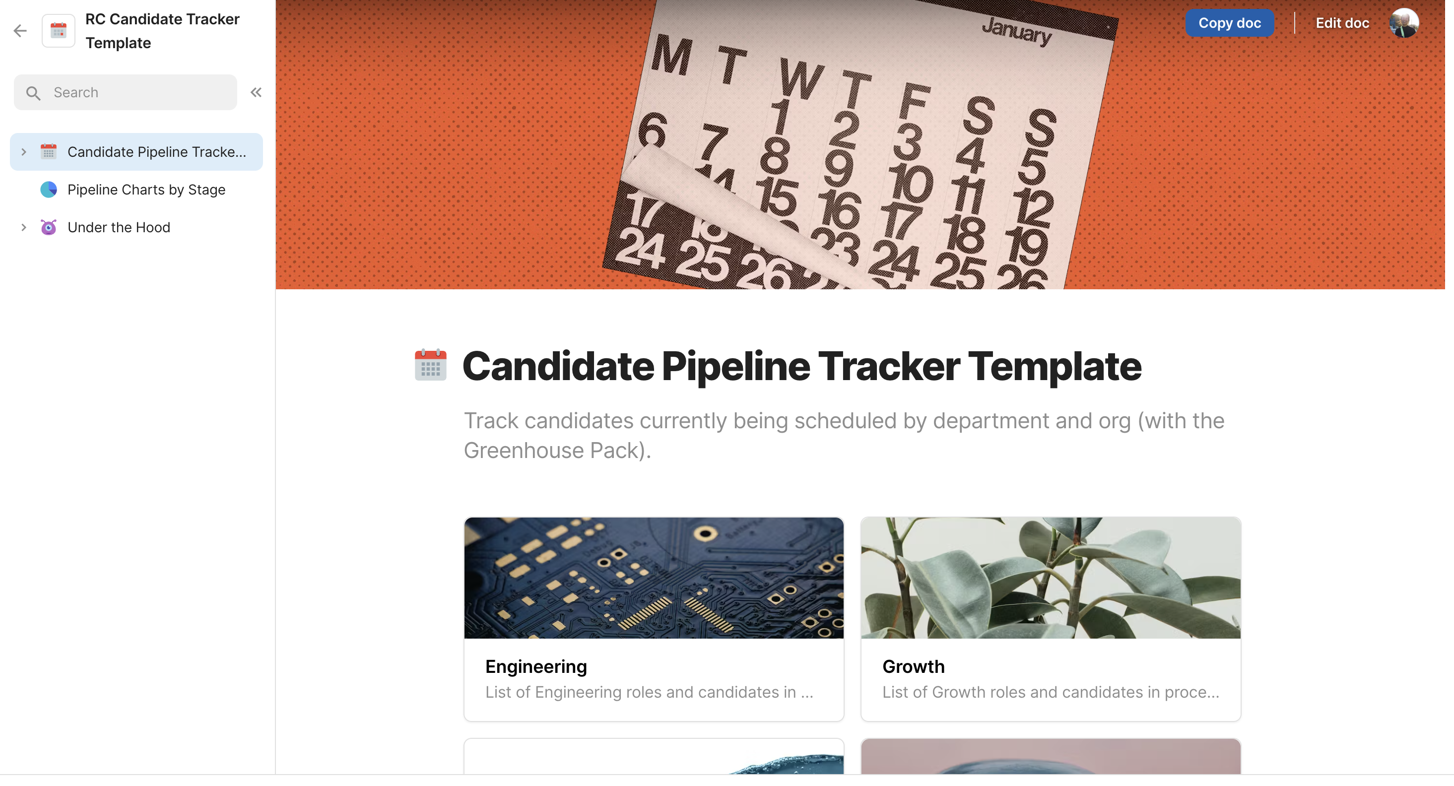 At Coda, we use Greenhouse for applicant tracking. We have a Greenhouse that integrates with Coda and pulls in live updates. We include tables of relevant reports for our roles in our hiring sync docs and find it useful to be able to refer to that data at any given time to get the latest updates. Want to see how many candidates are in the onsite stage for a particular role? Curious how many days a role has been open? Need to check on the latest status for a high value candidate? All of these questions can be answered through showcasing your pipeline data as a chart (or other form) for trend analysis.