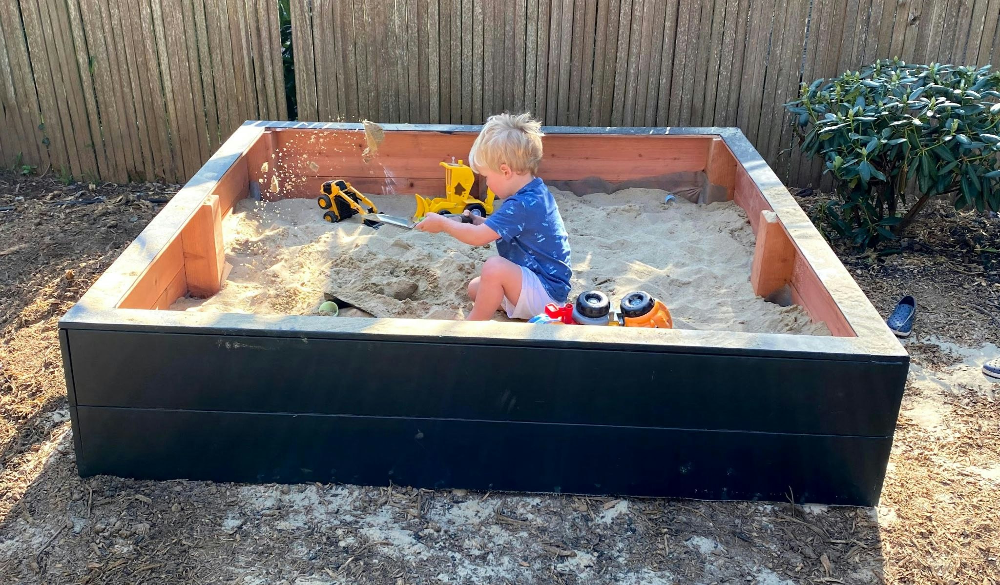 That's it. Here's Kal firing up his new sand toys in his new sandbox.