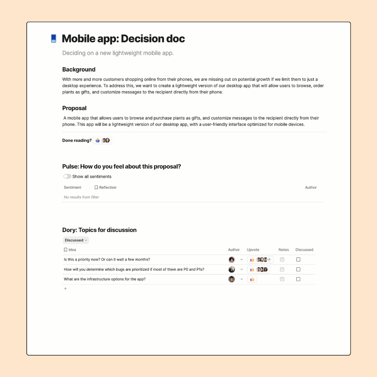 In the page, I’ll explain why product teams at companies like Zoom, Luxury Presence, Outreach, and many more choose Coda for decision docs over Google Docs and other alternatives. The patterns we see in the best decision-making rituals boil down to a few simple things. First, they aren’t just PM theatre, they lead to actual decisions on hard topics. To do so, these teams intentionally design their ritual to gather clear input from a range of stakeholders. That makes it easier for the driver of the decision to action the feedback and keep moving after the meeting.