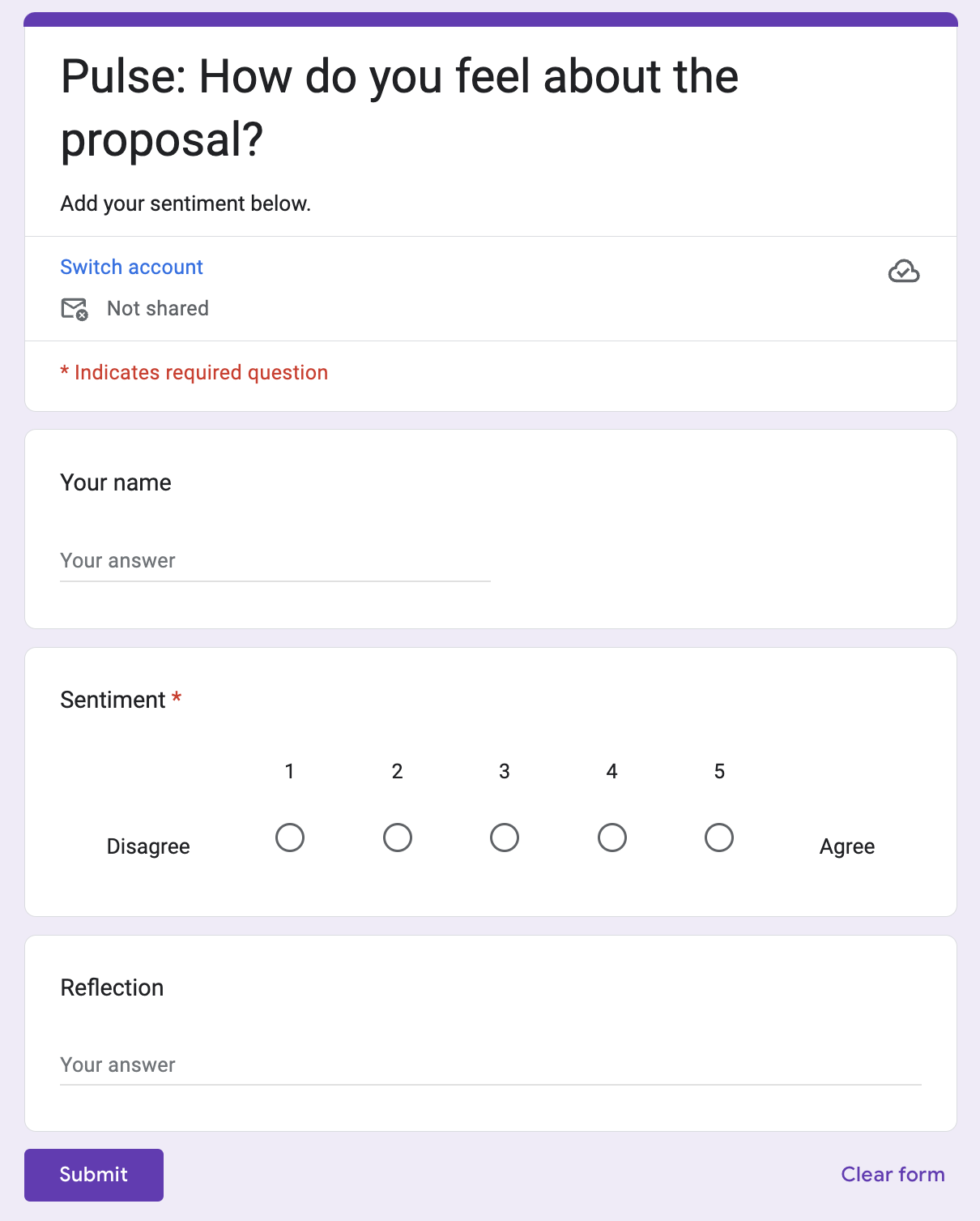 Switch to Google Forms (avoids group think buts add friction): But if what you really want is the “avoid groupthink” aspect of Pulse, then most teams switch over to Google Forms for this. It’s pretty heavyweight (having to set up the form, design the questions, etc.), but it does work. You would just design a form that looks something like this: