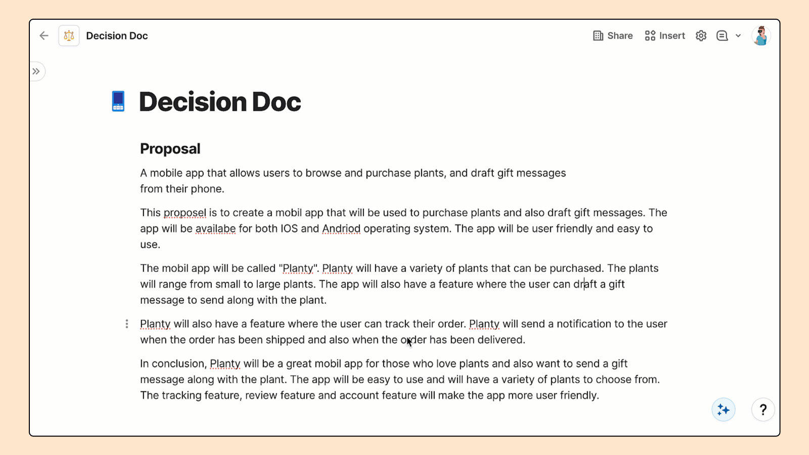 Like most of the world, Coda customers love exploring the possibilities AI brings to improving how teams operate. As background, Coda AI now supports a number of different modalities. You can check it out at . For Decision Docs, the obvious way to use Coda AI is in the writing phase, where it acts as a writing assistant that forms a list of ideas, adds and augments writing, and refines writeups to ensure clarity. One of my favorite ways to use Coda AI as a writing assistant is to ask it to proofread my work like this: