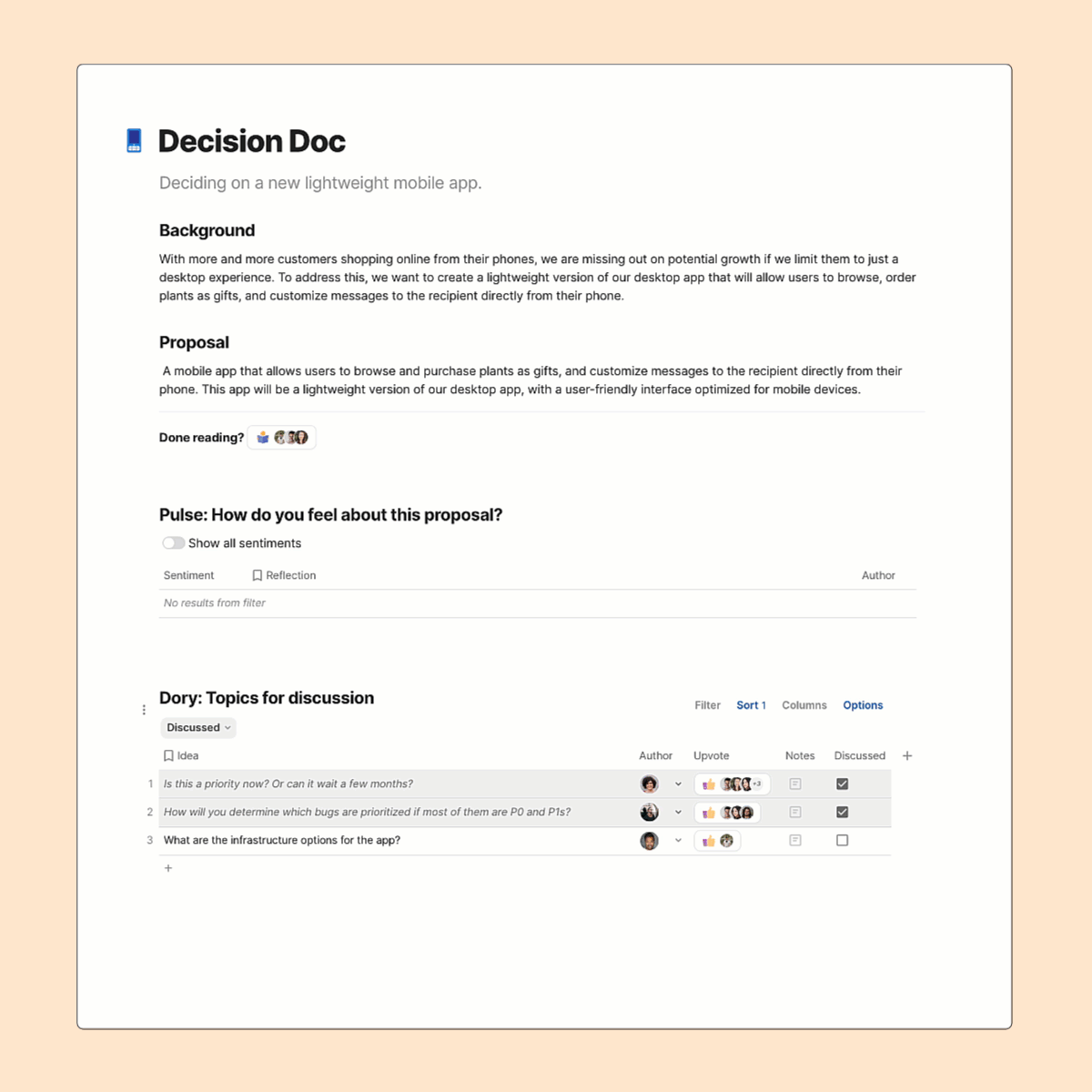 Pick an upcoming decision. Write it or copy/paste your writeup into a Coda doc. Add an interactive decision template by typing /dory and pulse.