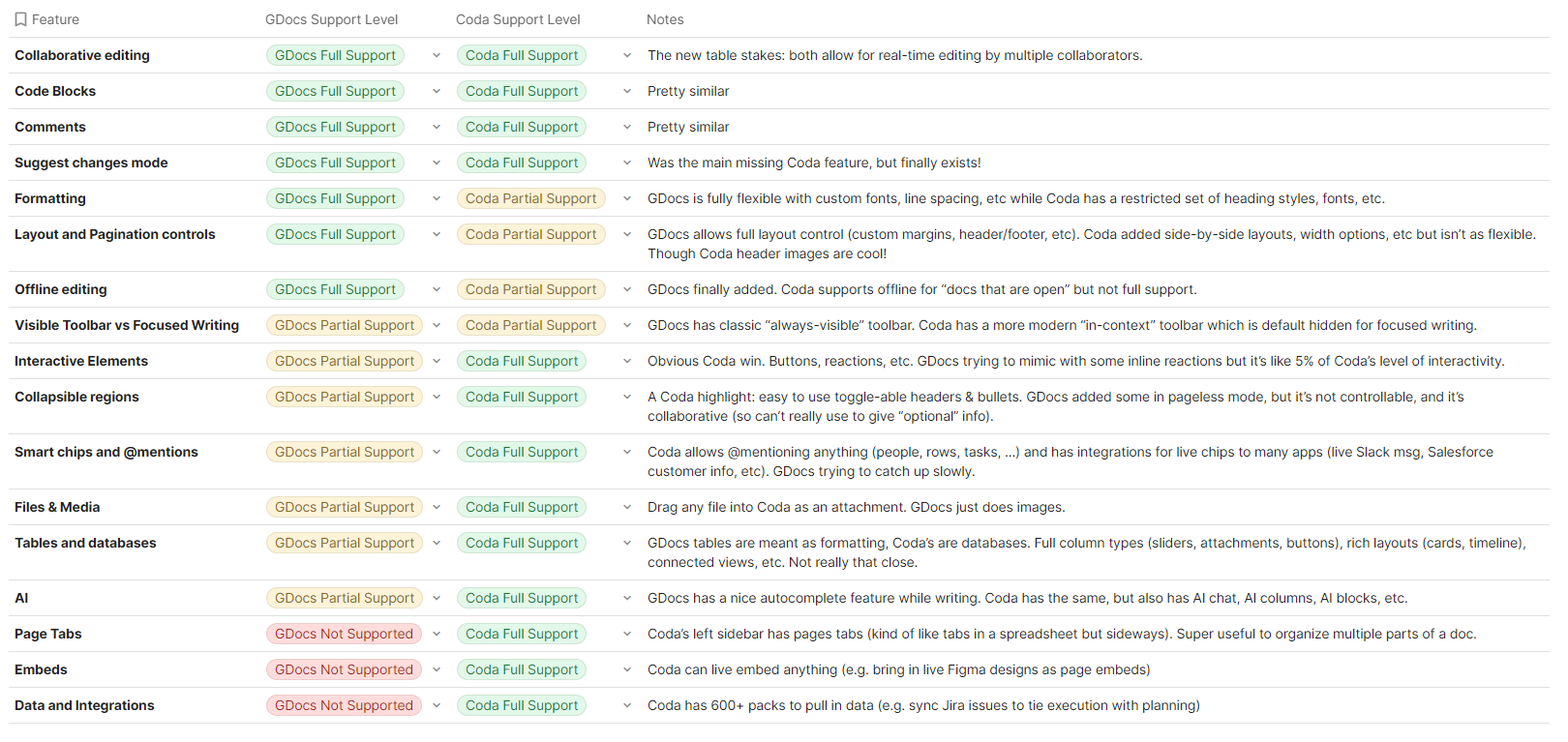 “We’re shifting to Coda for our decision memos! You can see a template at [link]. It’s a bit of a change from our current Google Docs model. But don’t worry, Coda is everything you love about Google Docs, but with a few new (important) bells and whistles.” The fact that they included this last line was very interesting to me, so I reached out to learn more about what they meant. What I learned was that they had tried to shift to Coda a while back, but had stalled when the team asked about some of their favorite Google Doc features. It seems that they did an evaluation and Coda was missing one critical feature—a “suggest changes” mode. When we , they decided to take another look. As a part of that, they shared their evaluation with us. Here it is: There’s clearly still a difference. Google Docs continues to be a type-setter’s dream—Coda lacks the formatting and layout flexibility that you would need, for example, if you were writing a printable book. But for modern teams making collaborative decisions, teams tell us that Coda has covered the primary set of features well—especially reviewing and commenting. And generally they call out that features like interactive buttons and reactions, collapsible regions, left-hand page navigation, and embeds/integrations are very important additions.