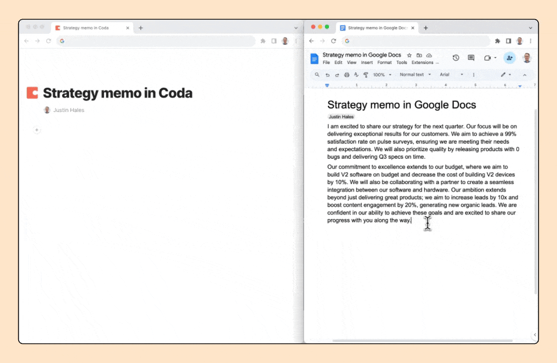 Tables and views, instead of copy and paste: In spreadsheets, collaborators often copy and paste and end up losing data or breaking things. By contrast, Coda has a concept of tables that can have different connected views. That way, when you update a row in one place, it updates everywhere, across all views of that data. This makes creating and updating a set of planning information or OKR data much easier because teams can have views of data built just for their needs. Loading video: Views keep everything updated.mp4...