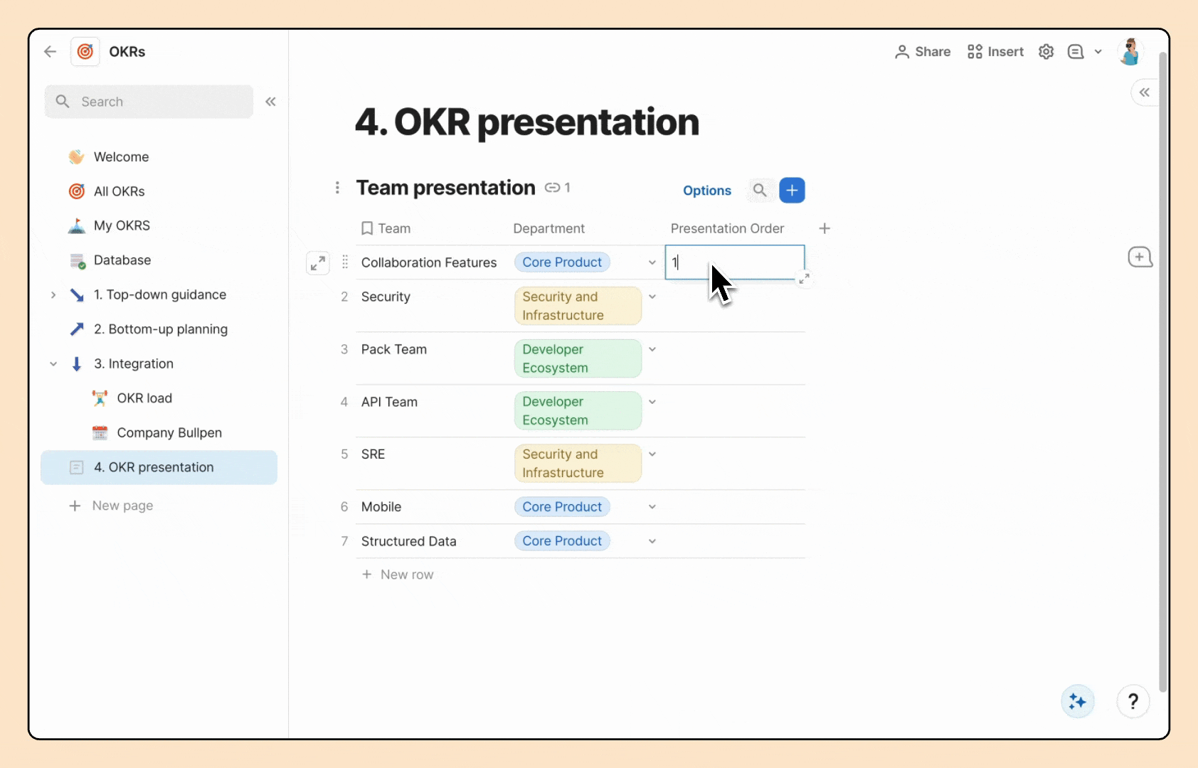 A page from which to present your teams’ objectives. A single source of truth for reference about the presentation. 1. Create a new page for team presentation of OKRs.