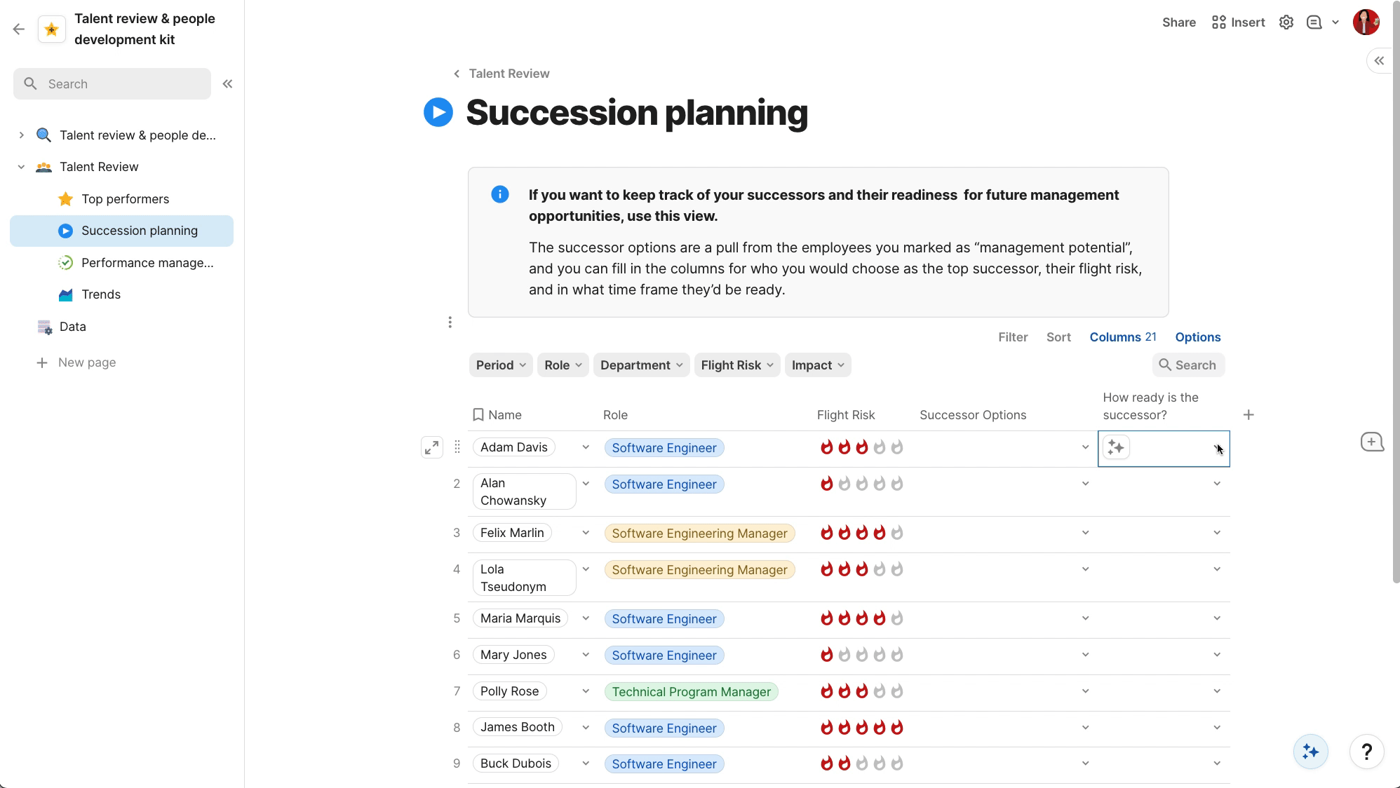 allows you to log who is a flight risk, their successor options, how ready the successor is, and even things like the impact of the person leaving and any plans in place to prepare for the change. And you can keep this all in one place, connected to other talent review input like your performance ratings. Explore the rest of the People Team handbook: