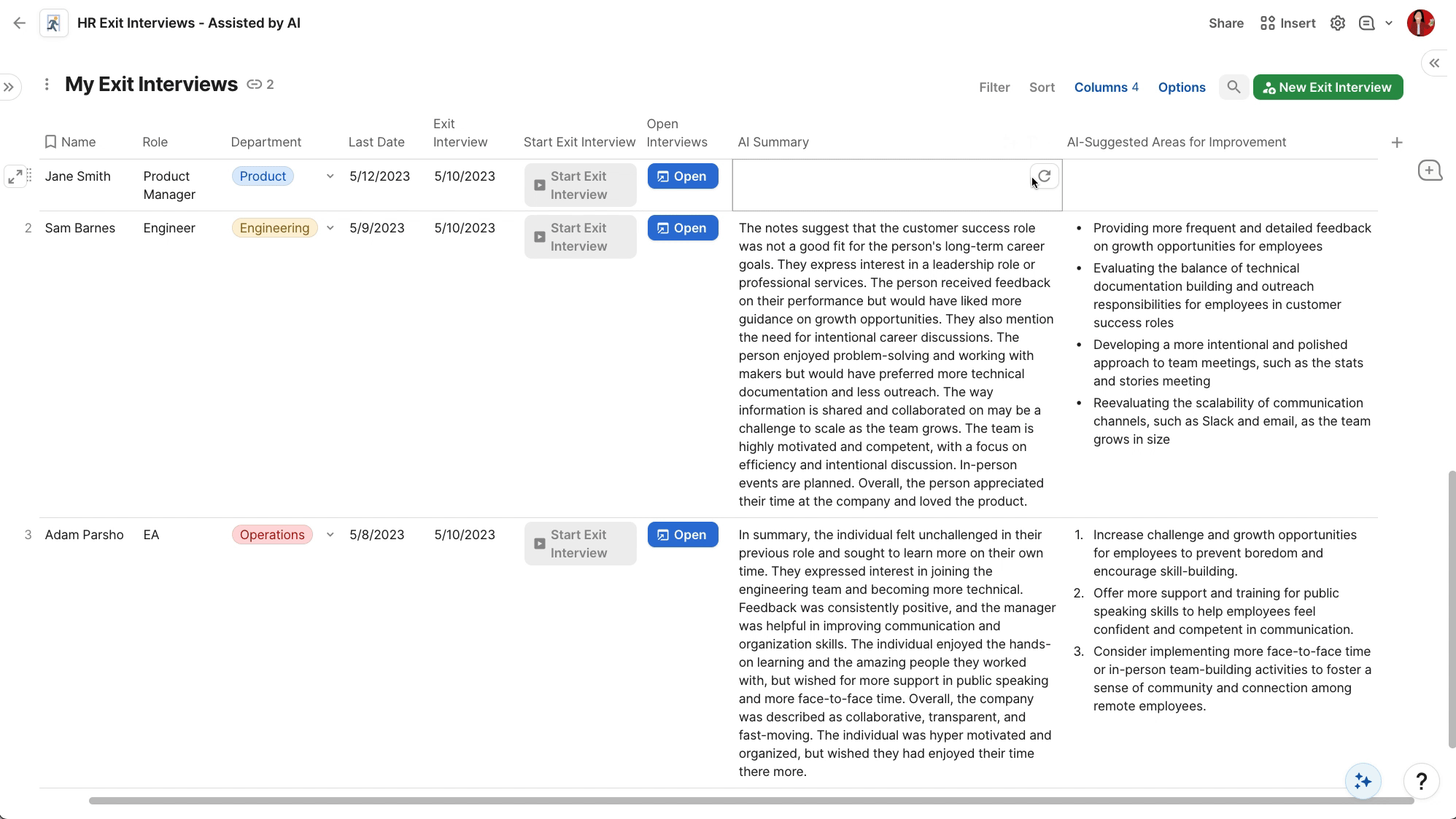 Instead of copy and pasting your set of questions into a new document and having to add relevant details like name, exit date, etc., each time, lets you automatically generate your question set and pull in aforementioned details. And with Coda AI, you can quickly create a digestible, actionable summary from the meeting notes. You can even use it to summarize groups of interviews across time to see if there are any recurring trends or issues. It feels just like magic! Check out the template here for an immediate value-add to your exit process.