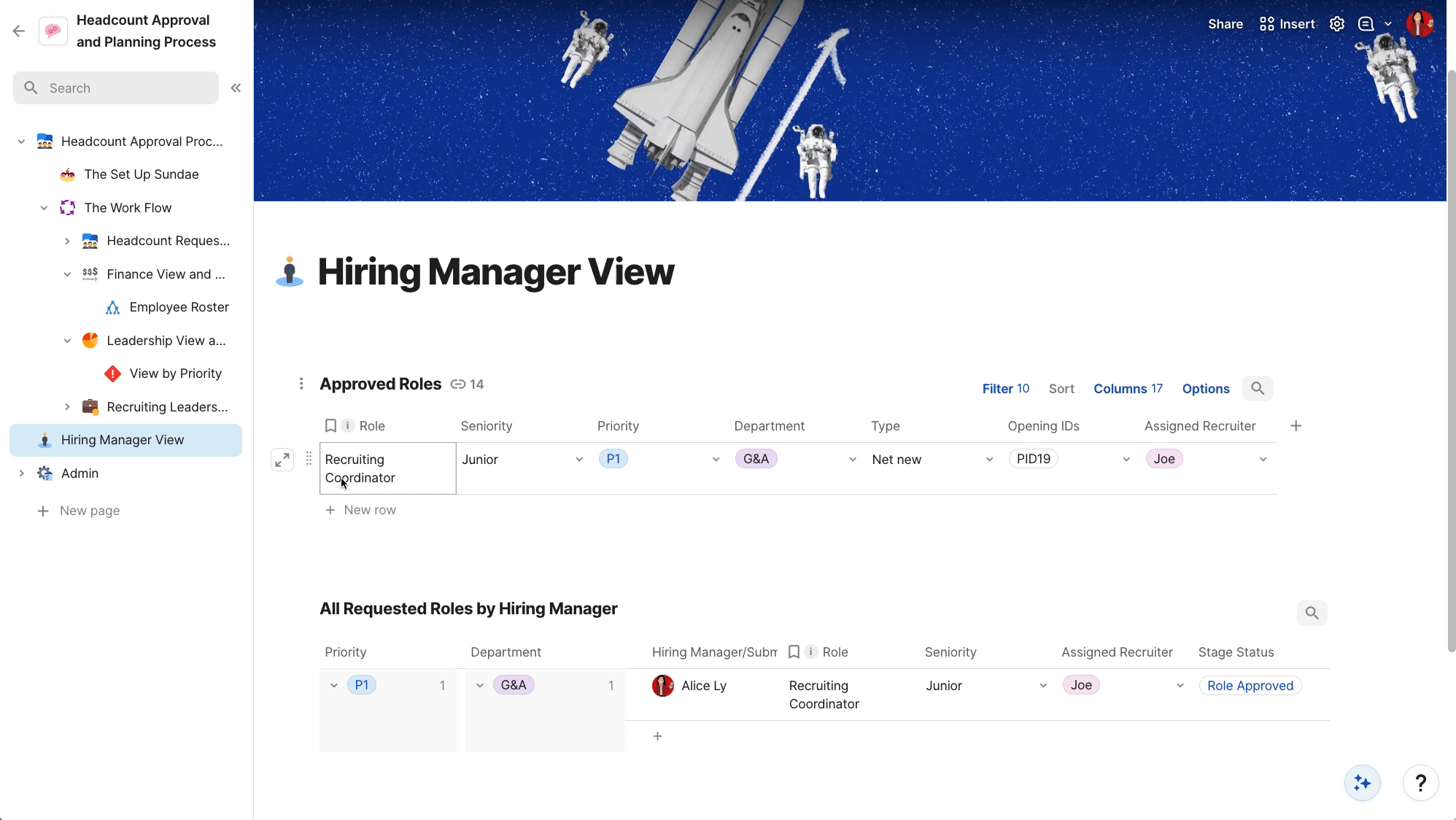 Once the form is filled out, it will go through an approval process. With Coda, you can create different views for each stakeholder in the process, but know that everyone is looking at the same underlying data. You can also automate updates to the hiring manager as the role goes through the different stages of approval.