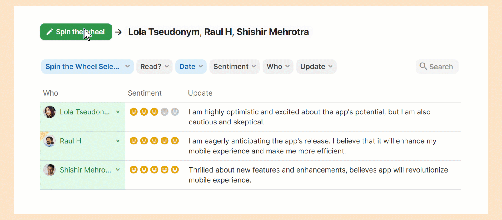 Example Spin the Wheel meeting: The button selects 3 people randomly and highlights their updates for discussion.